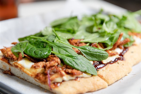 Remove from the oven, top with baby spinach, and slice into quarters.