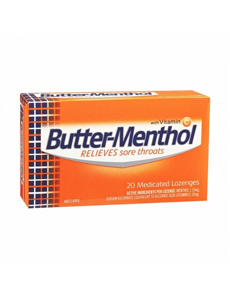 Butter-Menthol medicated lozenges combine mild menthol to actively relieve mild sore throats and stuffy noses, with a great distinctive taste Australians know and love