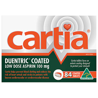 Cartia is a low dose aspirin that helps prevent blood clotting and reduces the risk of heart attack and stroke in patients with blood vessel disorders- Low dose aspirin helps reduce blood stickiness, the tendency of blood to clot.