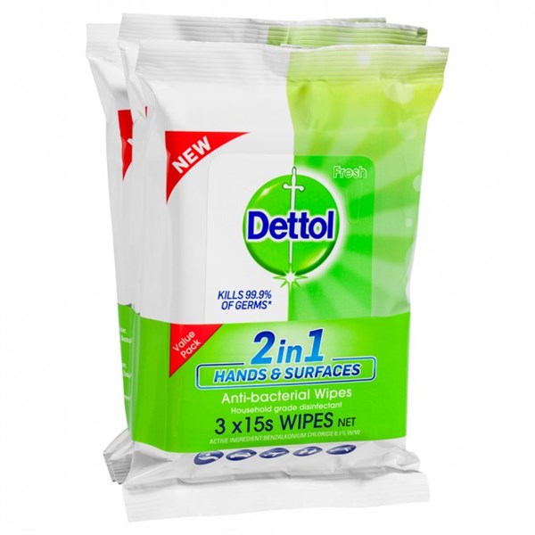 Dettol 2in1 Hands&Surface Antibateril Wipes 3 x 15 Pack
