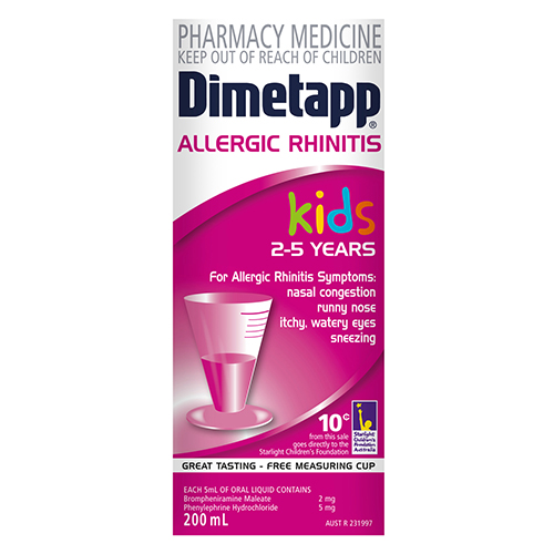 Dimetapp Kids Allergic Rhinitis 2-5 Years Liquid may help to relieve the symptoms of allergic rhinitis including nasal congestion, runny nose, itchy watery eyes and sneezing