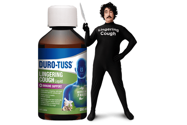 DURO-TUSS Lingering Cough Liquid + Immune Support works in 3 ways to help relieve a nagging, lingering cough that hangs around for up to 2 weeks at the end of the common cold1-3